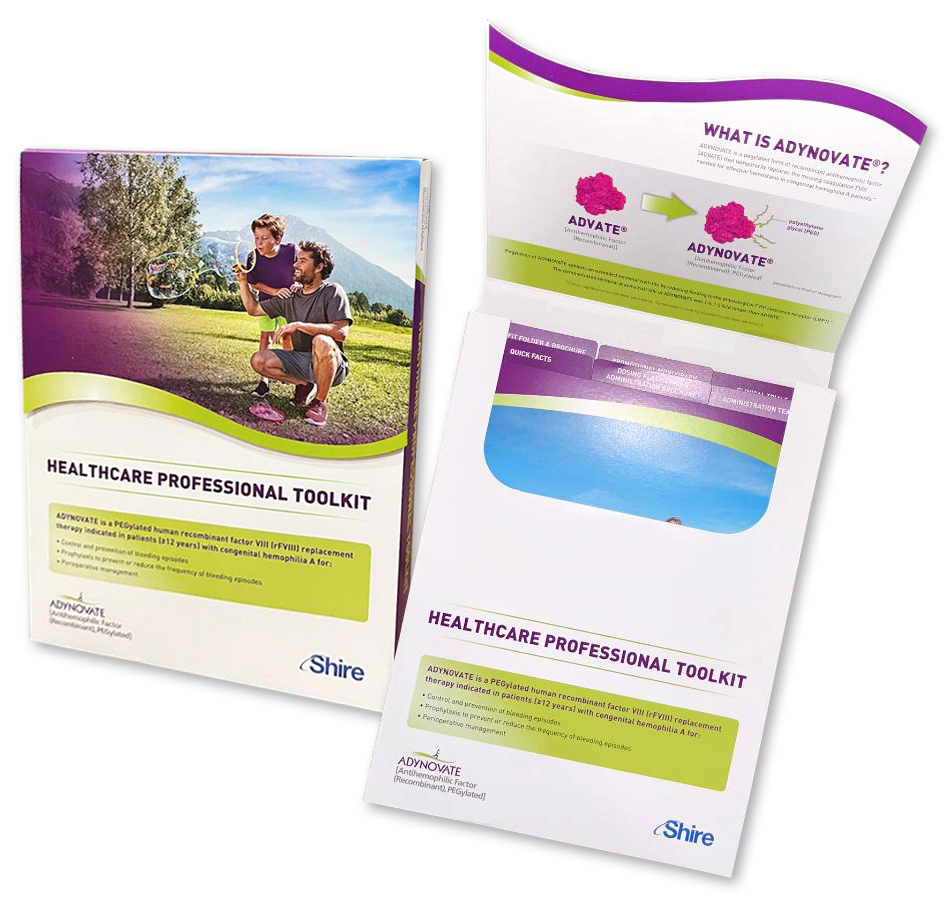 A custom designed toolkit with a magnetic closure to house various literature for healthcare profossionals educating them on the benefits of prescribing ADYNOVATE to help treat and control bleeding in children and adults with hemophilia A.