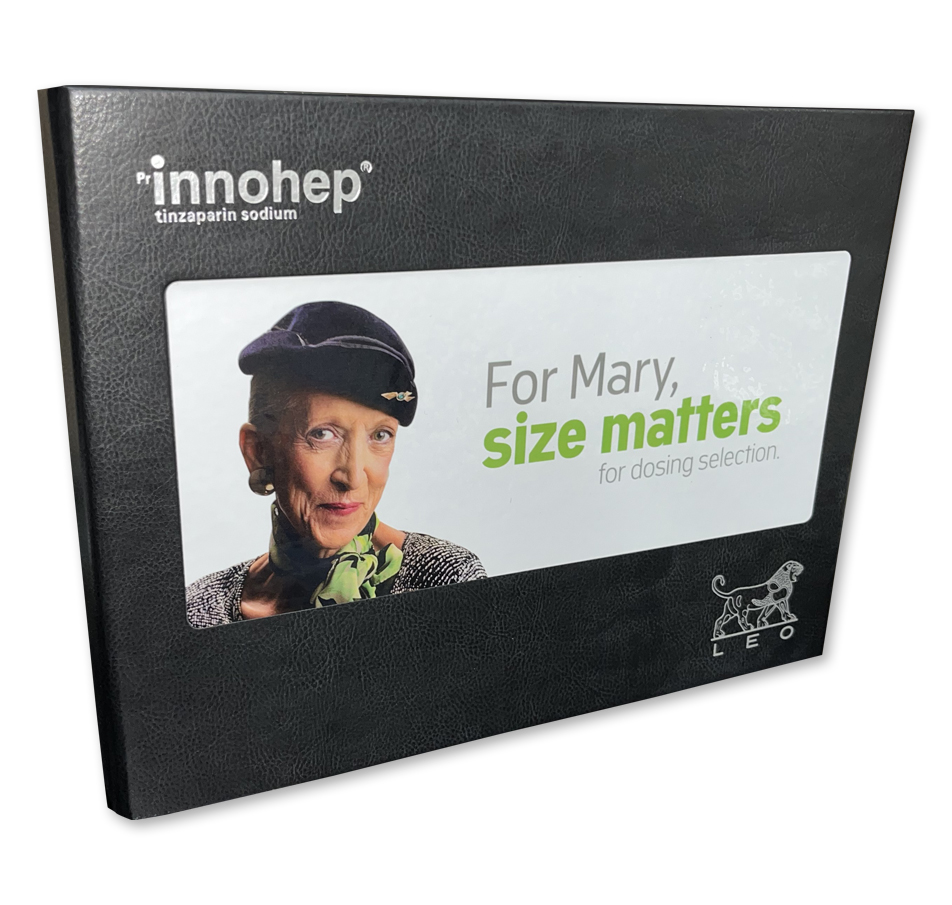 A custom leatherette-bound dosing selection kit with magnetic closure for healthcare professionals housing injections for patients.