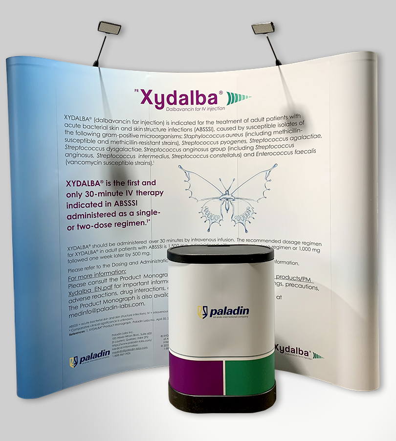 10'x20' booth designed with a 10-foot backlit backdrop and two 5-foot display along with counters, a touchscreen display and custom printed pillows.