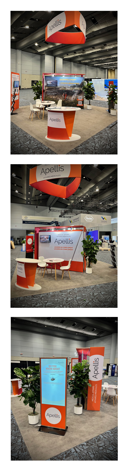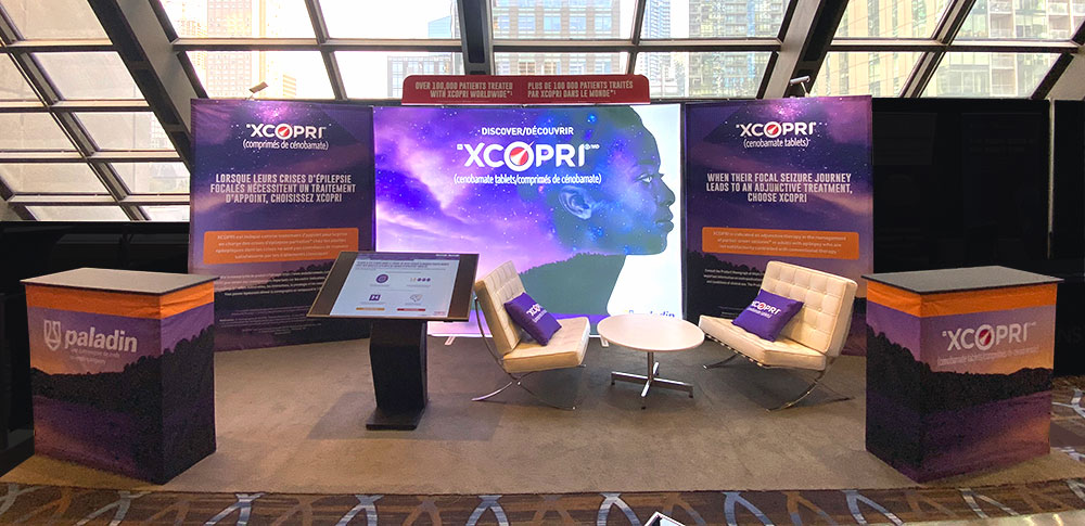 20'x20' booth designed with two backdrops (medical and commercial), two countertops, four monitors, and a touchscreen display.